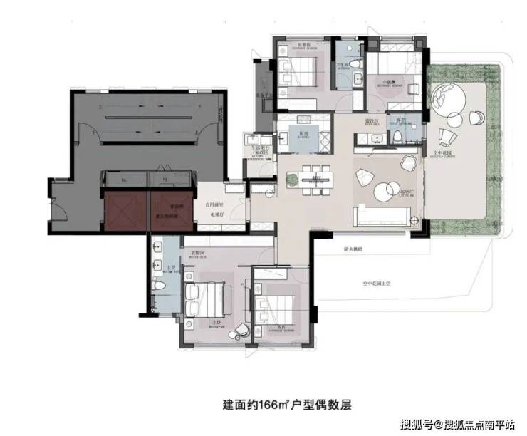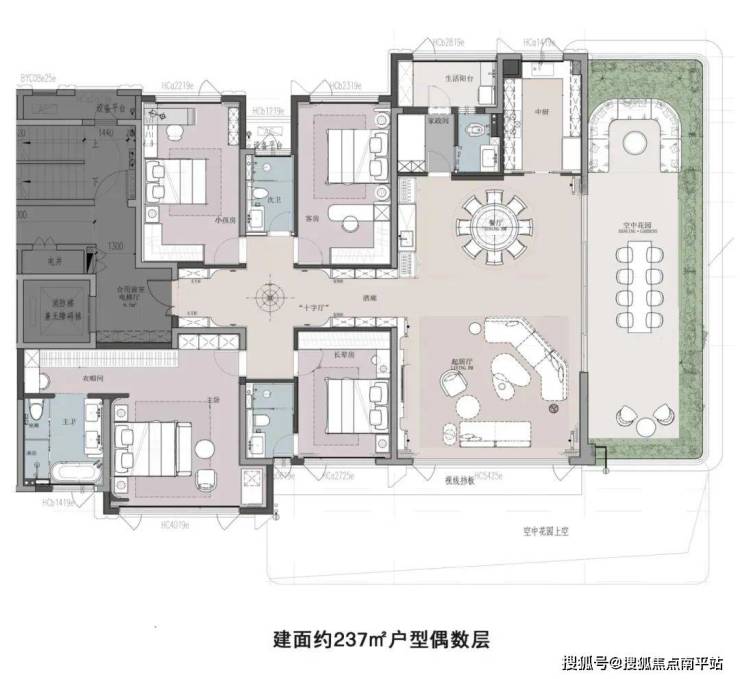 全盘共规划15栋住宅,合计户数650套,其中普通住宅4栋(184套),户型为建面约150㎡四房两厅三卫,生态住宅11栋(466套),户型为建面约166-320㎡空中花园平阔墅,以纯粹大户型成就高端人居作品。