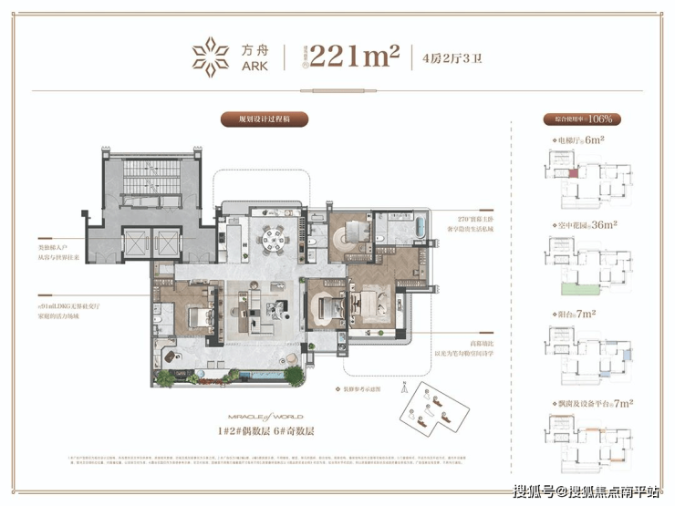 建面约221㎡户型:阔绰尺度感再加码!搭配约6㎡私属电梯前厅,彰显名门望族的归家礼序。