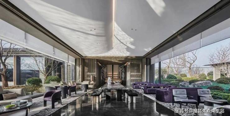 洽谈区靠近窗户布置,原始自然的材质与室外的园林景观相呼应,仿佛将室内外空间合二为一。黛紫色的家具作为点睛之笔,赋予了空间优雅沉稳的气质,精致的陈设突出了独特的美感,营造出一个放松和宁静的栖息地。空间中弥漫着淡淡的草木香气,与室外的自然活力相映成趣,激发了人们对美好生活的向往。