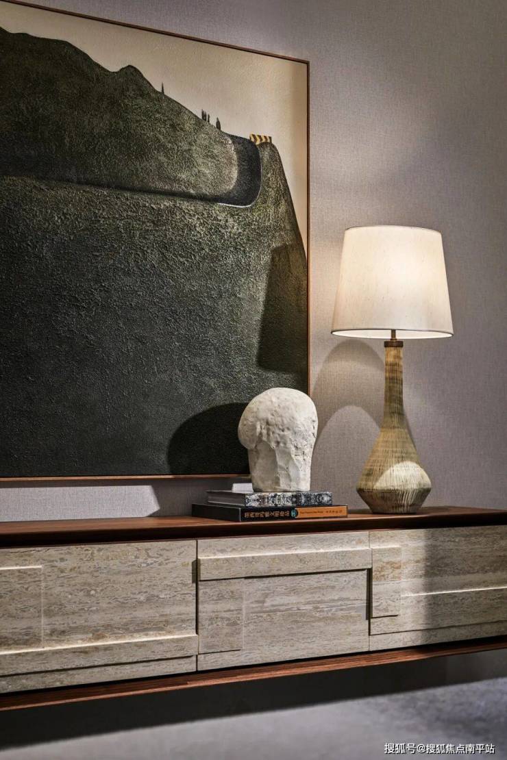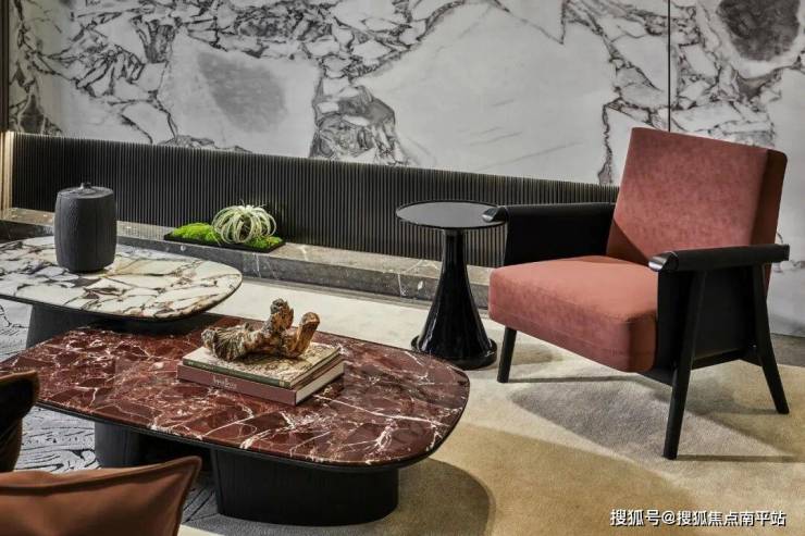 客厅以柔和、安然的暖色调诠释,暗红色的单椅与大理石茶几,搭配米色沙发与水墨大理石背景墙,深与浅,豁达与入微,沉淀与当下,共同拓写隽永美学的故事。