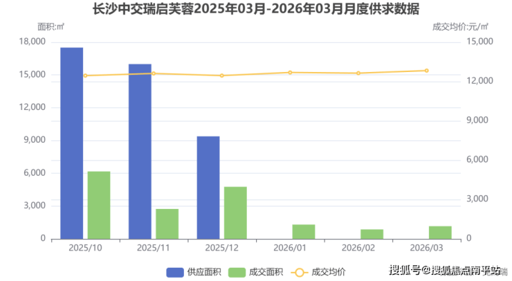 解读:数据显示,中交瑞启芙蓉自2025年10月首开以来,成交均价稳定在12500元/㎡左右,波动幅度极小。虽然供应面积逐月减少,但持续有成交,说明项目去化稳定。数据来源于克而瑞。
