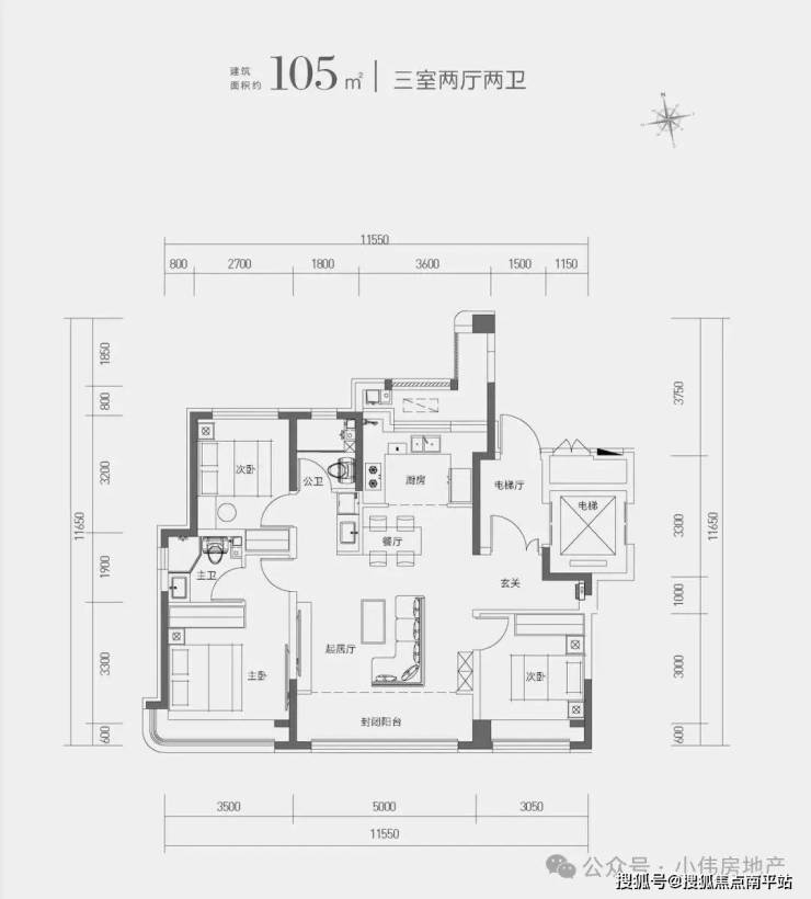 洋房主力户型为105-139㎡三室两厅两卫,全部采用“一梯两户+贯通梯”布局,独立电梯厅搭配内外双玄关,私密度与仪式感兼具。建面约139㎡户型更以7.7米超大宽厅、IMAX级落地窗(4.5米×2.25米)与餐厨一体化设计,重构家庭社交场景;主卧L型转角飘窗取消承重柱,实现真正的“无界视野”。