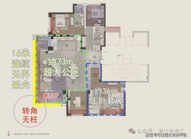 建面约73㎡的LDKB超大公共空间,面积相当于别人一套小户型!酒店式主卧套房的面积约36㎡,给你南向浴缸+5㎡女王衣帽间,将奢阔尺度+生活享受拉满。