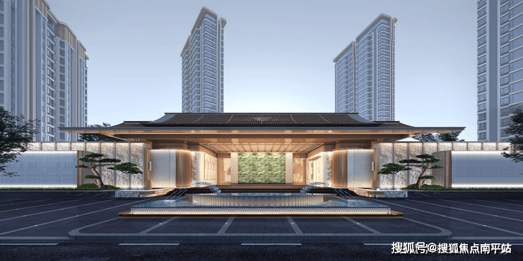 ④.豪宅的领地感:别具一格的奢阔门庭设计,从效果图上能看到新中式屋檐、大面奢石、台地叠水带来的独特审美,也能感受到属于豪宅应有的领地感,视觉感拉满,昭示性超强。