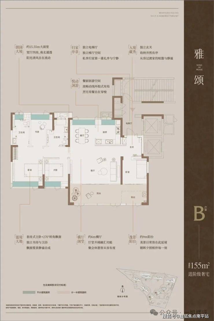 先来看A户型建面约155平四房,分布在2号楼小高层中,以及3号楼的东边。