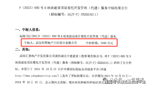 早在去年10月份,该项目就发布P(2023)090号B地块建设项目委托开发管理(代建)服务中标结果公告,显示结果就是招商代建。