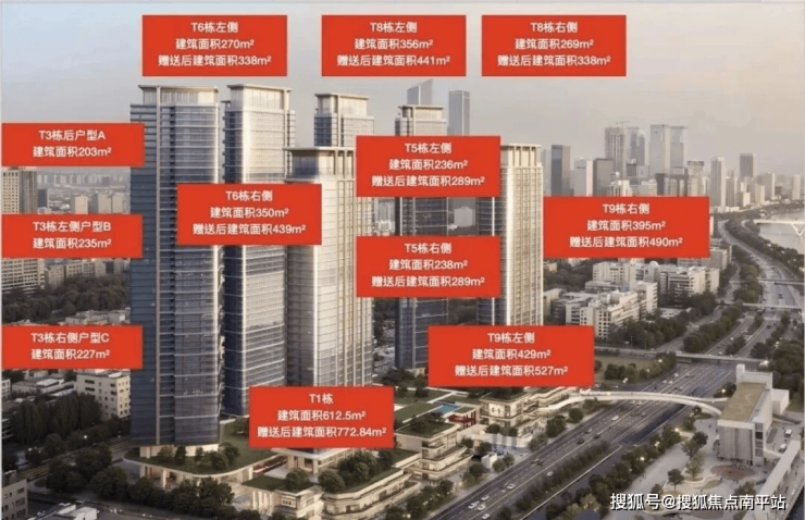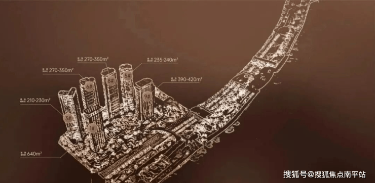 产品分布如下:1#,35层高,只有一个面积段,约630㎡户型;3#,50层高,约205-236㎡户型;5#,50层高,约236-240㎡户型;6#,49层高,约270-350㎡户型;8#,49层高,约270-350㎡户型;9#,37层高,约377-405㎡户型。1#和9#承担最大面积,所以一线头排望江;6#和8#面积段其次,因此位置稍微靠后,但也能做到垂直望江;1#和5#是200+平专场,视线就需要避让头排,斜出江景。