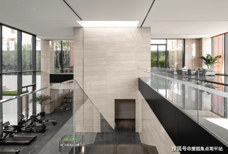 会所与下沉庭院,通过递进的空间高度变化、共享与通高玻璃幕墙让空间流动起来,以流动空间串联地上和地下空间,组织会所功能,带了连续内敛、层级丰富的空间体验。
