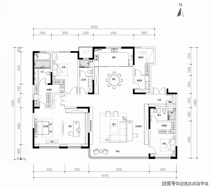 该户型约19.1米南向面宽,四室朝南;约8.1米长,270度观景阳台;主卧沉浸式独立衣帽间。