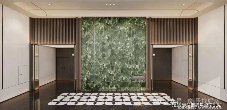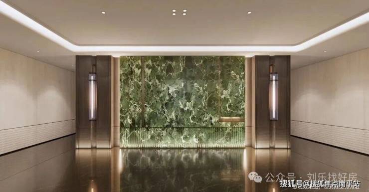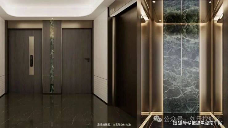 星级类私厅入户,定制化电梯轿厢酒店式一体化美化设计,电梯门楣上方均用金属雕刻项目图腾,门牌:意大利大花绿岩板+氛围灯,彰显业主气质;电梯轿厢正面采用大版面意大利大花绿岩板,镜面金属吊顶,地面为定制墨染流云奢石嵌以金属logo,侧面配置了人脸识别的梯控面板,无触归家