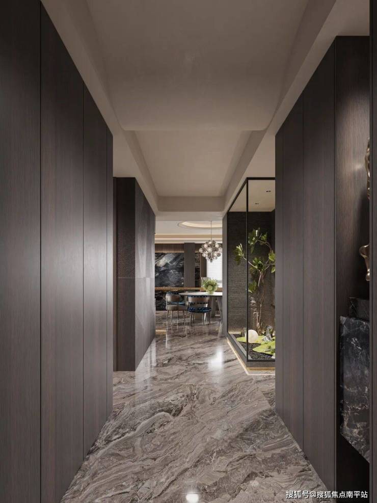 - 过渡序章(走廊/玄关):利用深邃的木饰面与星空顶营造仪式感,两侧设置室内微景观(枯山水+绿植),通过框景手法引入自然生机,为进入核心空间做铺垫。