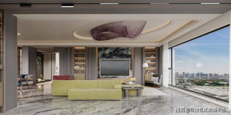 - 核心社交区(客餐厅):采用LDK一体化设计,释放超大空间尺度。客厅保留全景落地窗框定城市视野,搭配悬浮式壁炉与艺术感水晶吊灯,构建兼具社交与休憩功能的度假式客厅;餐厅区域运用深色大理石+艺术吊灯,营造围合式的宴请氛围。