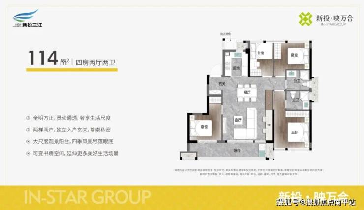 在户型设计上,新投・映万合聚焦建筑面积约 81-114㎡的三至四房,既尊重青年群体的预算限制,又为家庭全生命周期成长预留空间。