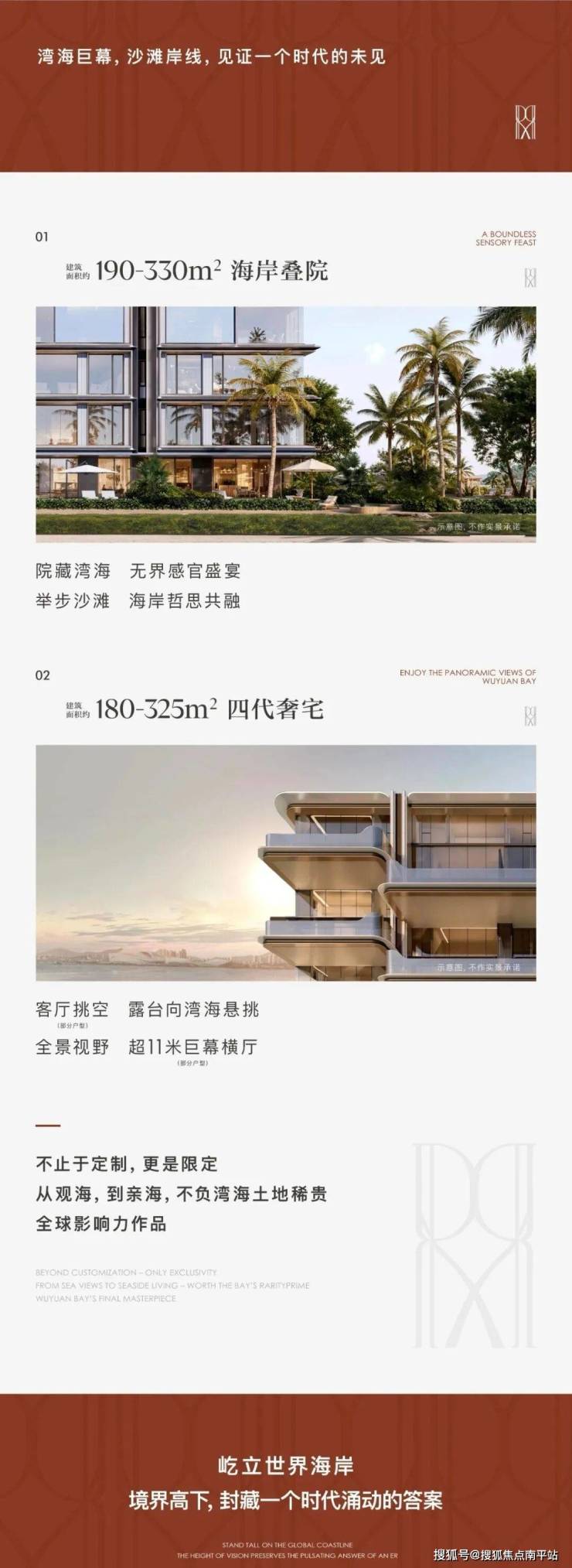 第二排小院墅面积190-210㎡,兼顾舒适度与私密性。第三排洋房170-180-333㎡多元户型,其中下院170-210㎡、平层180㎡、顶复333㎡,第四排规划4栋四代高层,面积段235-280-325㎡。产品自带6米挑高设计,搭配超11米巨幕客厅,坐拥一线海景视野,观景体验拉满。这样的户型分布,也足以反映出项目定位之高以及面向客群之优质。