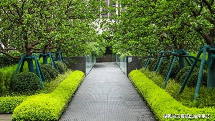 建筑立面以现代线条勾勒山形韵律,与 自然对话;园区归家小径两侧植乔木,四时景异,步移景换。