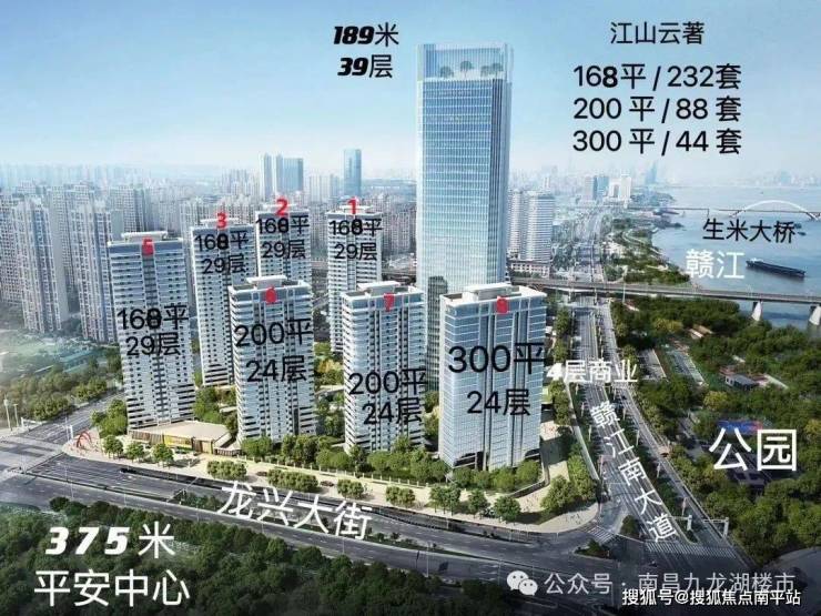 江山云著,距离南师附小九龙湖校区2.32公里,距离南昌外国语九龙湖初中1公里,距离南昌地铁四号线安丰站500米 ,位于赣江南大道以西,龙兴大街以北,城运路以东,南洲街以南,共7栋住宅和1栋超高层,总户数367户,容积率3.5,绿地率30%,第一太平戴维斯物业5元,2026年6月毛坯交房,机动车位1506个,其中地上停车位62个,面积约166平4/2/3-210平5/2/3-300平5/2/3-430平6/2/3-630平6/2/3左右,一梯一户设计,毛坯交付,小学读南师附小九龙湖校区和中学读南昌外国语学校九龙湖初中部。