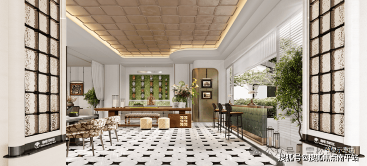 •新中式园林、约1500㎡无界架空会所设计、下沉庭院等。
