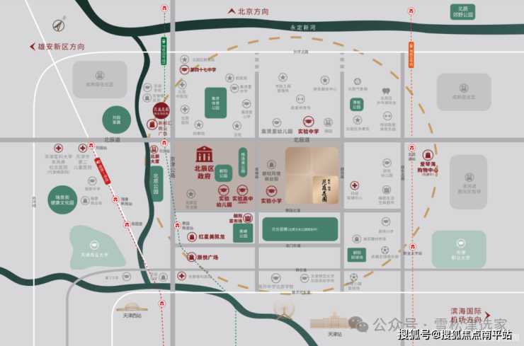•北辰区最优教育资源:项目周边2公里范围内有19所幼儿园,6所小学,6所中学。地块西侧和北侧约600米分别紧邻北辰实验小学、北辰实验中学,约2公里则是四十七中(市重点)、华辰学校,教育资源雄厚;