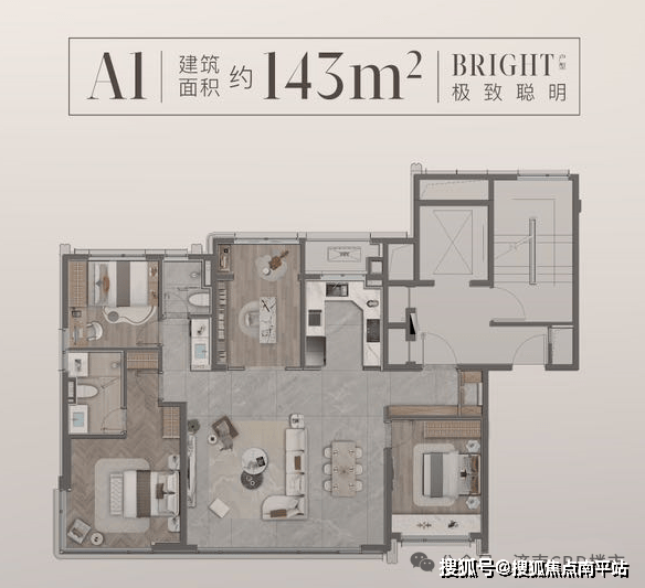 1、143户型做出来的效果是宽厅四室,厅宽6.75米,理论上很完美。