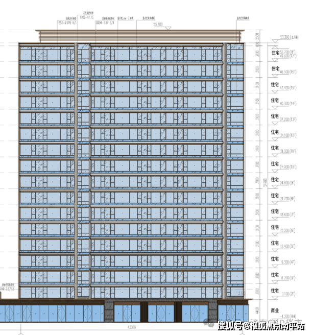 6、小区东南角是2号楼,总高17层,总高53.45米,1层商业4.62米,如果商业在楼底下,根据这个数据,层高还是3米,数据不算低,但是,要知道,现在大多数改善层高3.1米、3.15米太正常了。