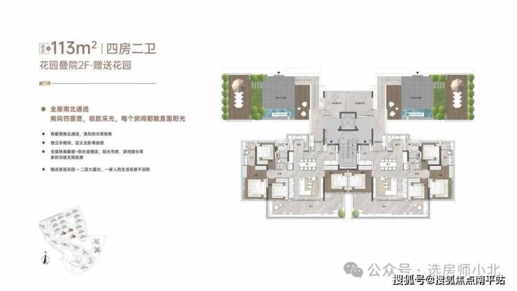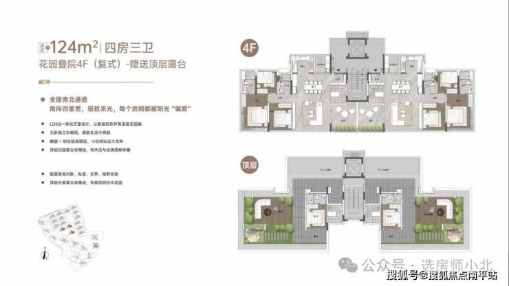 这是最接近墅级形态的户型,下层做了侧花园设计,顶层的天面露台全赠送,实现了约242%的使用率