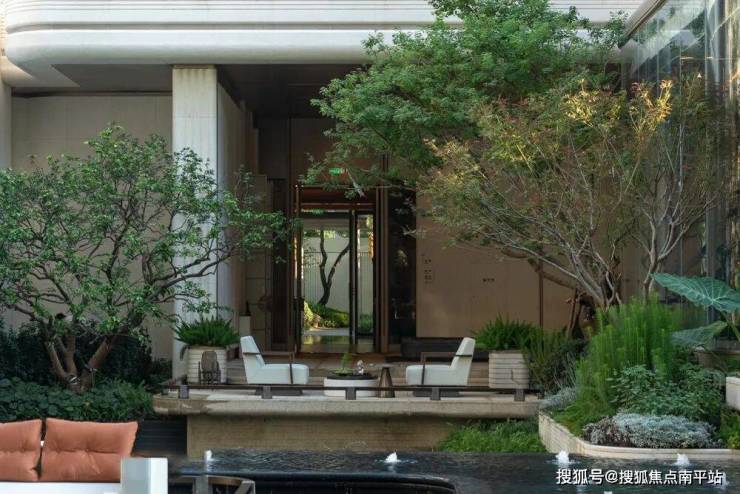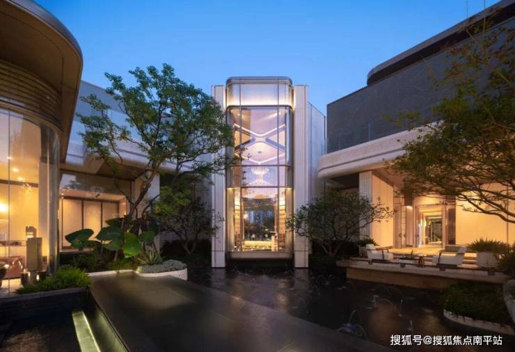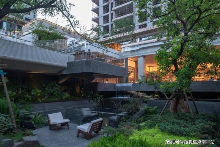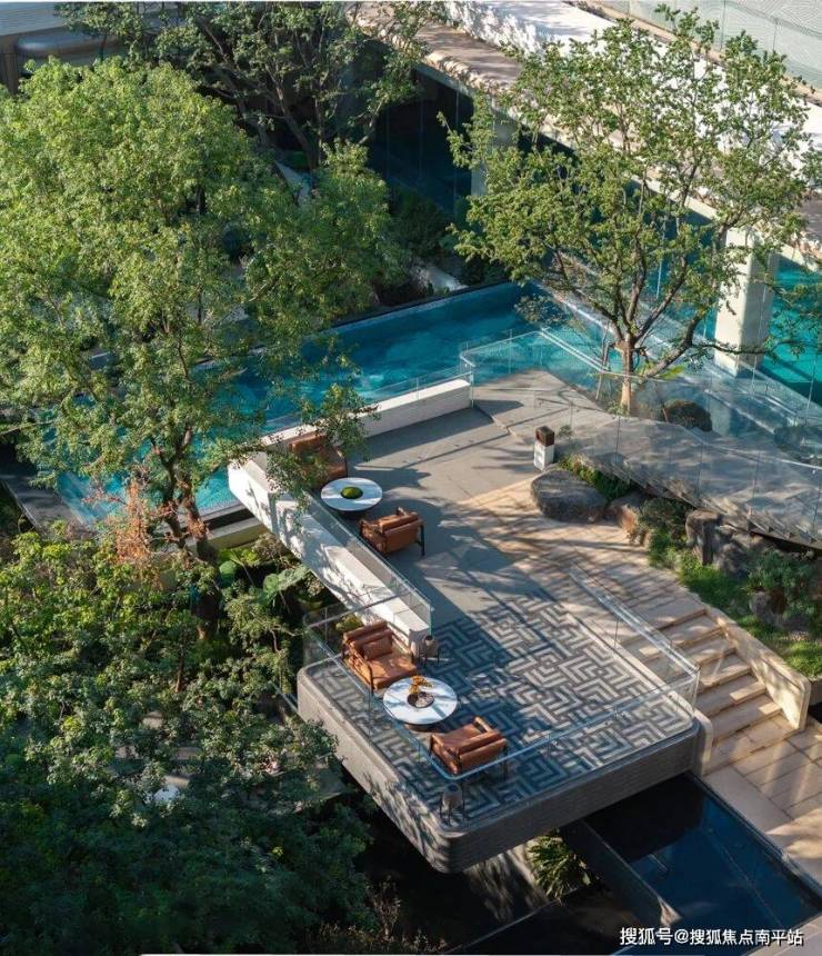 庭院,一方闹市中宁静的绿洲。走进这片园林,城市的喧嚣被隔离在外,树影青葱,镜面水景层叠错落,如同玲珑的百宝盒,洒落在山涧中。 多层景观台地弱化场地高差,形成层次丰富的立体景观;四面悬浮感玻璃盒子环绕,模糊室内外边界 ,山水之色与精奢生活在其中无缝衔接。