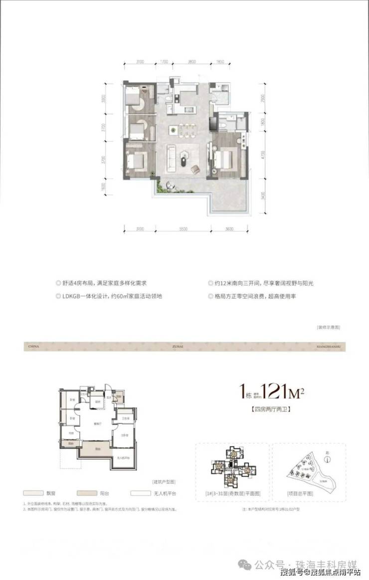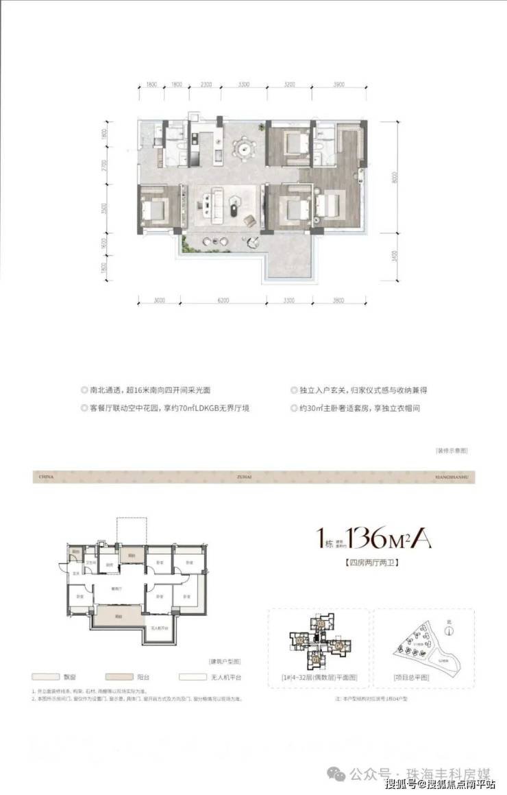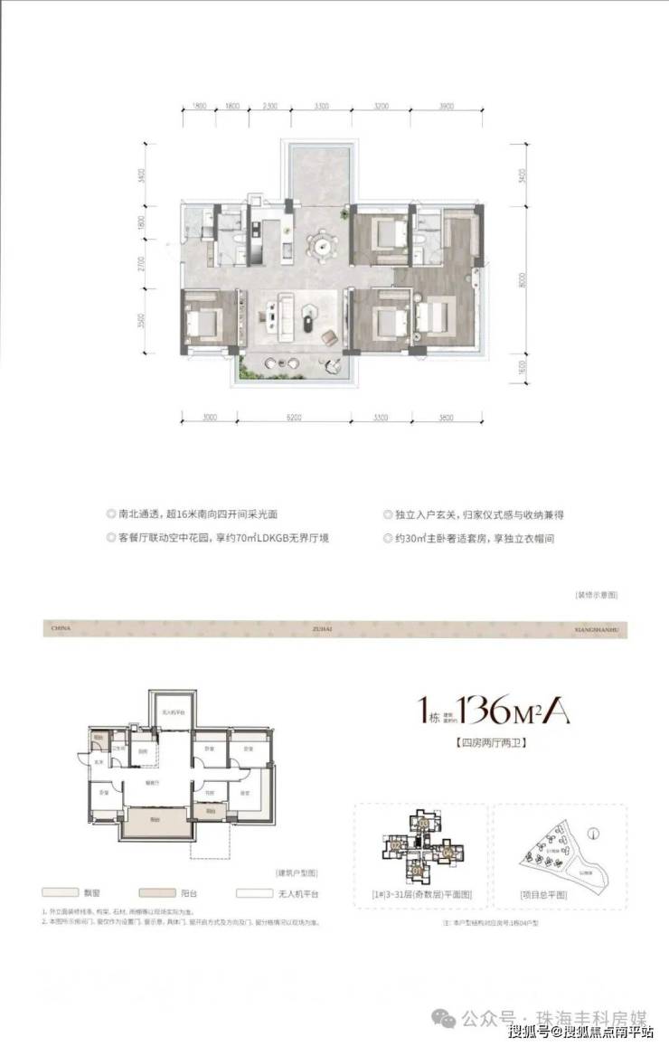 作为珠海市“四化”新型住宅试点,达到智慧住宅三星级标准,每户配备3m×3m无人机物流投递平台(不计入产权面积)。建筑采用“未来舱”式设计,外立面以大面积玻璃和几何线条打造现代质感,空中花园平台错层布置保障隐私。