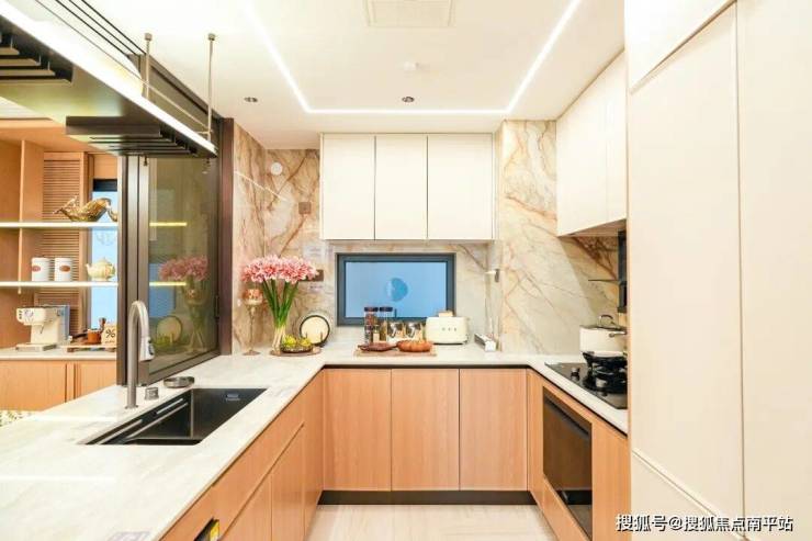 厨房与卫生间台面,升级为上海保利天奕、杭州保利天珺等顶豪同款台面,搭配楼王同款大吸力油烟机、蒸烤一体机与洗碗机,整体升级迭代。