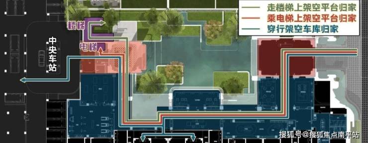 你也可从「中央车站」进入架空车库,穿行至自家楼栋,从车库大堂乘梯入户。