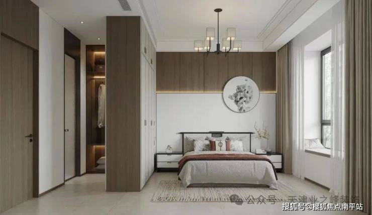 靠窗设置飘窗茶座,衣柜隔断设计,实用功能与美学表达并重。