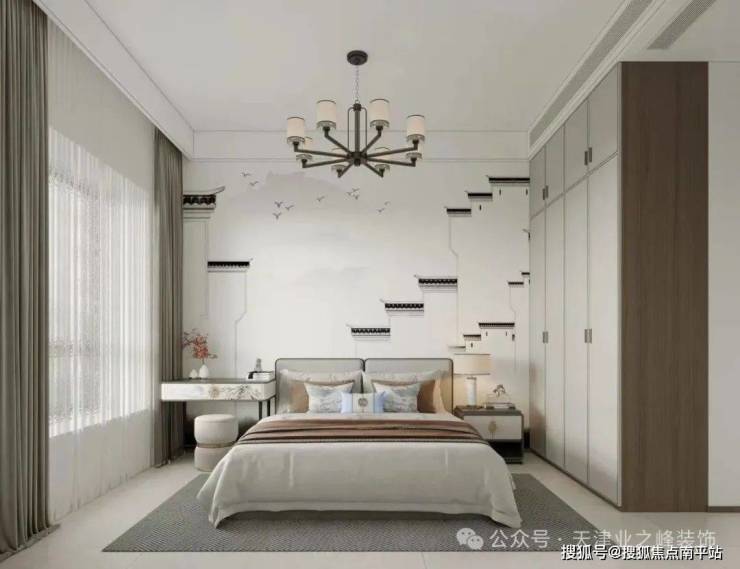 另一卧室则选用中式背景画装饰,靠窗旁边梳妆台,简约不失典雅。