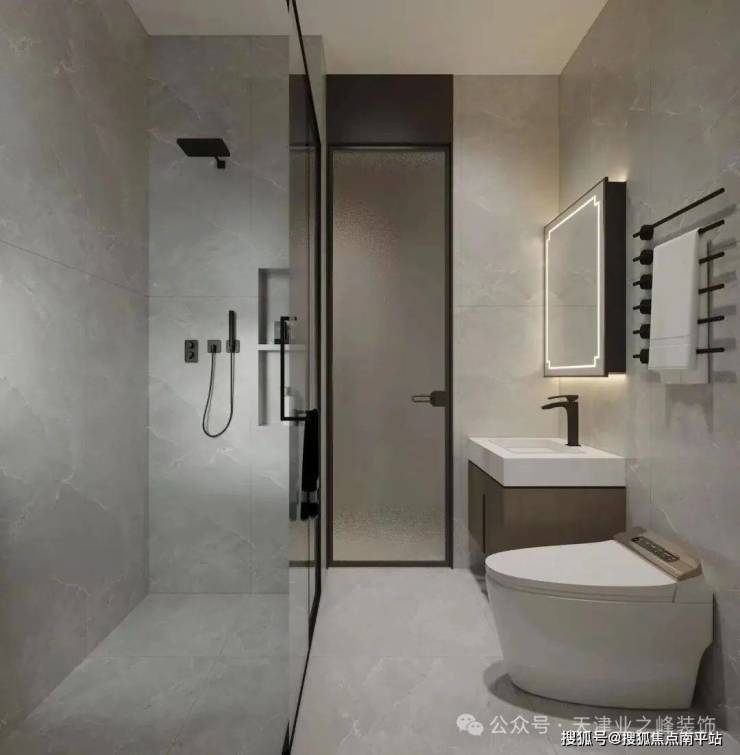 卫生间均实现干湿分离设计,灰色地砖通铺简洁耐看。其中一套做三分离布局,功能分区明确,进一步提升使用效率与舒适度。