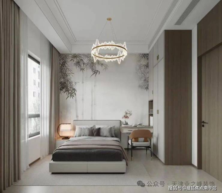 次卧以竹子水墨画为背景,衣柜与书桌一体定制,空间利用高效且视觉统一;