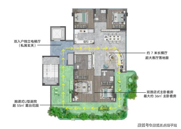其次, 使用面积超55㎡的空中露台、长达 约32米超长采光面、 约7米长横厅等居住尺度,不管是横向还是竖向,都拉开了更大空间。整个户型 超120%的得房使用率,这也是目前市面上其他同面积段平层户型难以超越的。