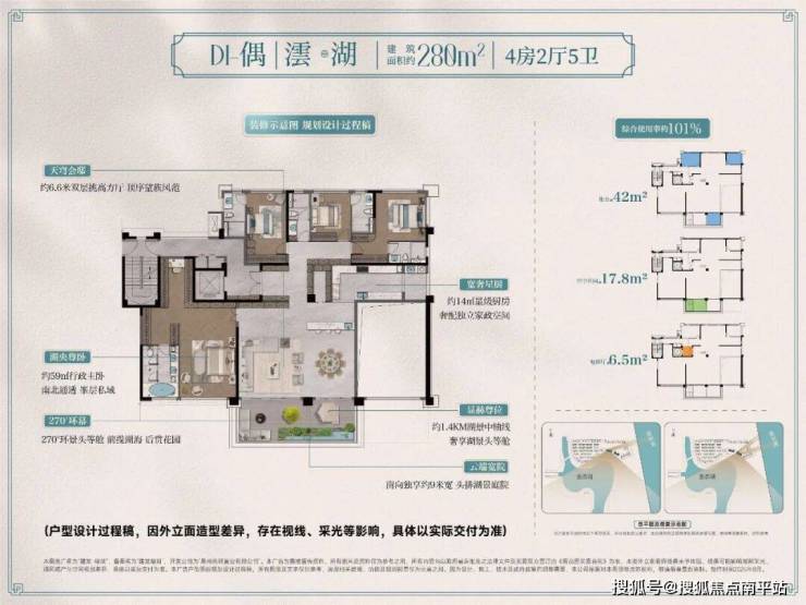 - 建面约280-293㎡户型,同样位处头排瞰湖视野,纯T2布局,综合使用率约101%。南向约63㎡双层方厅与约9米宽空中庭院,将“景观私有化”推向极致。类独梯独户、约6.5㎡独立电梯厅,以及可与别墅媲美的全套卧独立卫浴系统,重新定义该面积段的空间高度。