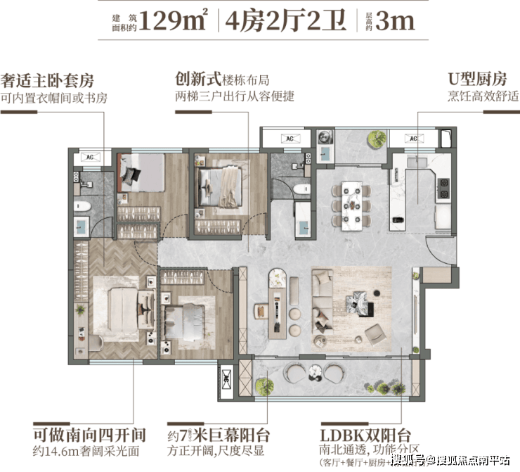 建面约129㎡墅级奢阔大四房,兼顾舒适与体面,打造品质改善标杆:
