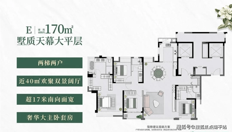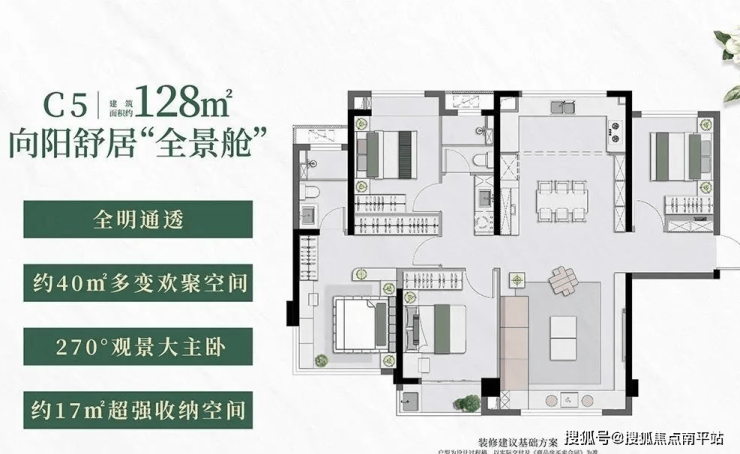项目全系户型3-5开间朝南设计,面宽尺度升级,室内采光通风效果拉满;尤其是建面约128-170㎡户型主卧配备270°L型观景窗,整体居住品质跃级提升。
