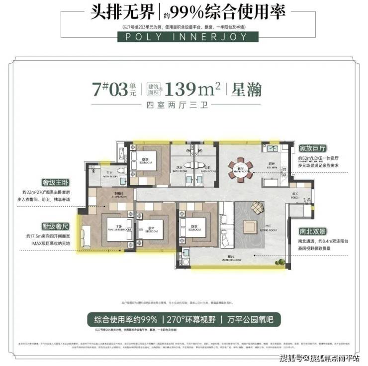 建面约139m²户型,综合使用率约99% (以7#203为例,使用面积含设备平台、飘窗、一半阳台及半墙), 约17.5m四开间面宽叠加极致窗墙比60% ,让空间与自然共鸣,全屋极致采光尺,放大生活舒适度; 约52m²LDKB一体宽厅 ,大尺度客餐厅、可开放式厨房空间成为全家社交、生活主场。 入口自带独立储藏室 ,超强收纳让家庭整洁有气场, 270°套房式主卧全景舱 ,清晨被阳光唤醒,从容梳妆洗漱,夜晚卸下疲惫,伴着温柔月色入睡,让理想生活在此真实兑现。