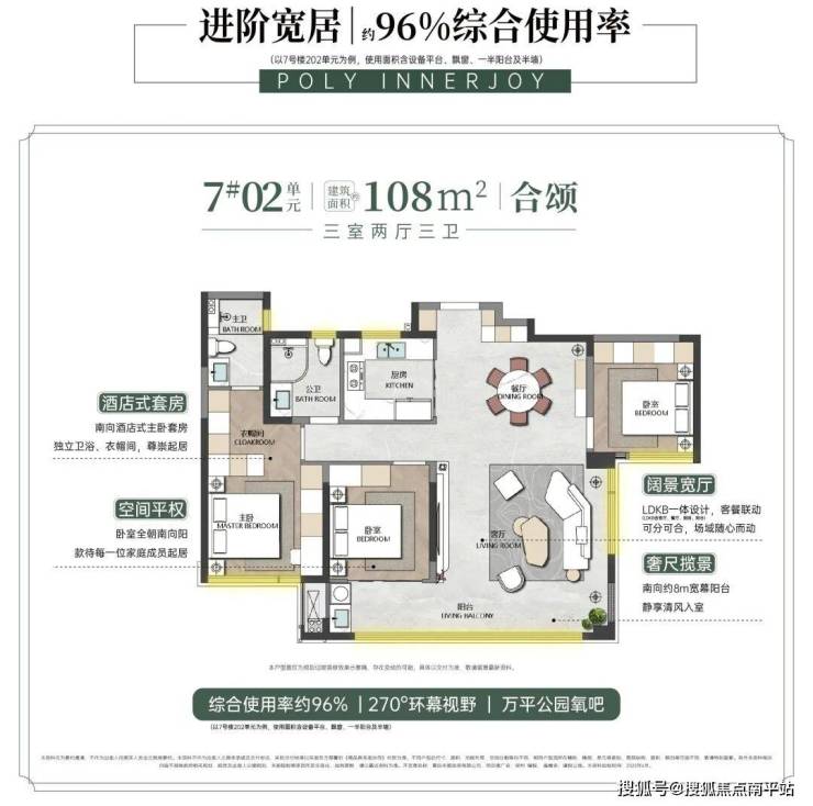 除此之外, 7#更打造全区仅16席的建面约108m²户型,综合使用率约96% (以7#202为例,使用面积含设备平台、飘窗、一半阳台及半墙),比市场同面积段户型 多出约10%的使用面积 ,改善的每一平米都被高效使用。 LDKB一体宽厅创新打造双落地窗 ,搭配 13.8m四开间朝南面宽与高通透窗墙比 ,实现 约270°双观景面 与让自然绿意更能肆意流淌入室。