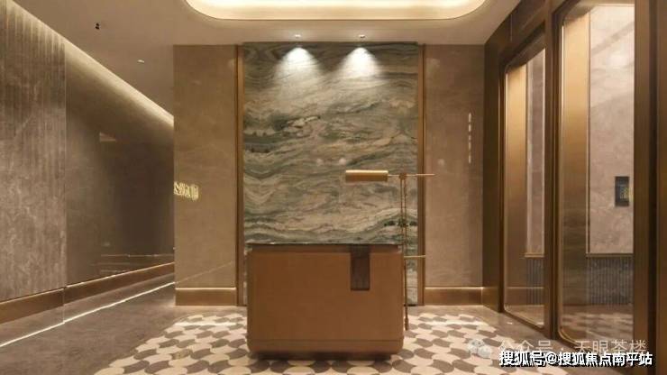 一进入户大门,就看到管家服务台,未来能提供钻石管家服务。拼花地砖、奢石背景墙、棕金框水波纹玻璃屏风,天鹅绒艺术漆吊顶与雕花电梯门, 对标五星级酒店式大堂。