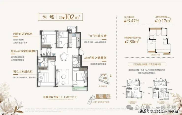 3、户型使用率高。我们在下节详细讲,通常市面高层得房率80%左右,前些年产品更是只有75%,那时82-89平仅能做2房、2+1房,102-113平仅能做3房,如今建发璞云凭借新规迭代+户型优化,户户约90%综合使用率,82-89平做到3房2卫,102-113平做到4房2卫,功能性和舒适性更强!