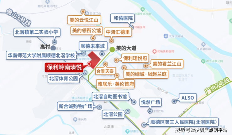 项目的地段位置是它的主要优势之一。根据资料显示,它距离广州地铁7号线美的大道站大约300米,一路之隔是北滘体育儿童公园和华南师范大学附属北滘学校。北侧不远处有中海汇德里公园街区,盒马超市预计这个月底开业,未来业主下楼就能逛。