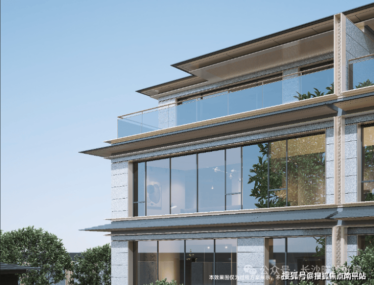 · 南居:大面积干挂石材与玻璃铝板结合的立面,“重檐”元素的东方气质,“线框造型” 强化别墅横向线条的大气磅礴之势,重塑金茂·璞印梅溪项目独有的建筑“符号标志”,革新长沙别墅高阶审美。