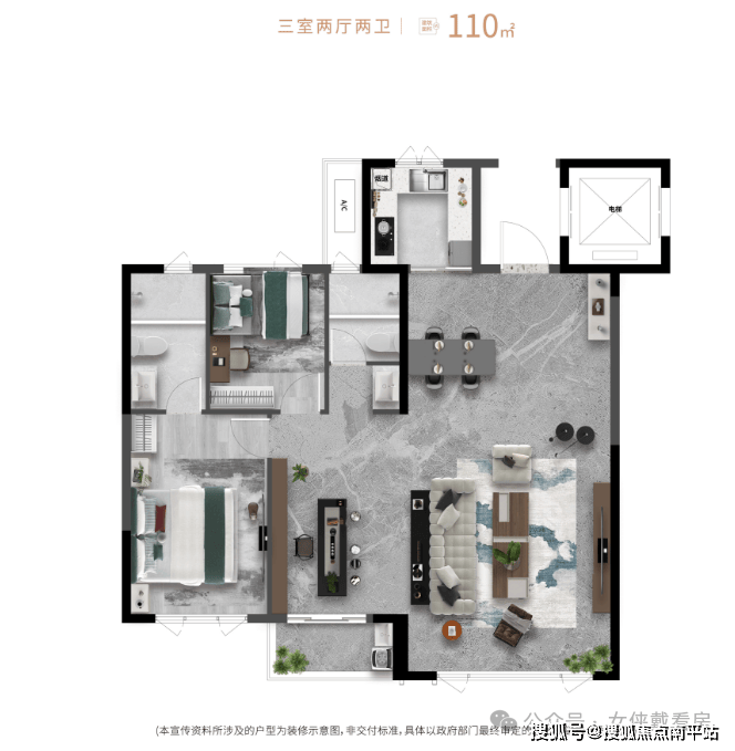 建面约110㎡户型:3室2厅2卫☎️☎️售楼处电话☎️☎️400-159-8559转接5555【已认证】(来电尊享优惠活动)