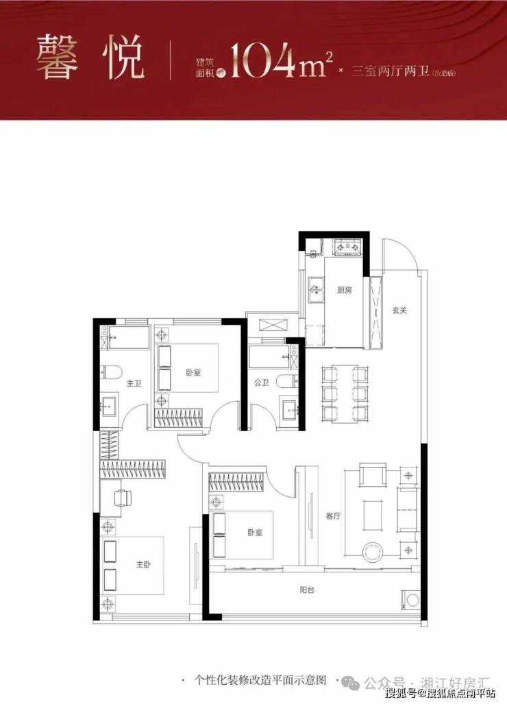 ↓这款 约104㎡新规三房 ,主卧面积达到约26平米,南向阳台开间约6.8米,可改造为大横厅,享阔绰空间及充足采光。