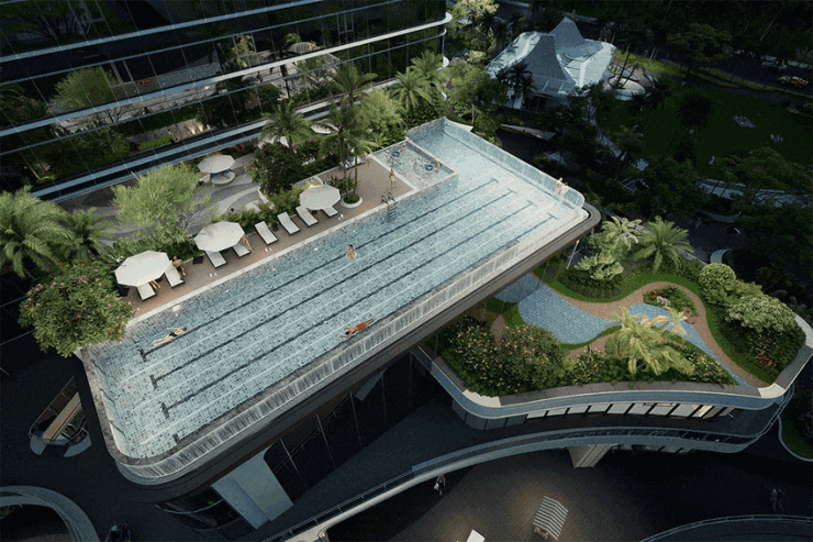 中央泳池面积约900㎡,成人池、儿童池与休闲区流畅布局,浅色大理石铺装池岸,在光影交织间,静静诠释热带度假的美学语言。