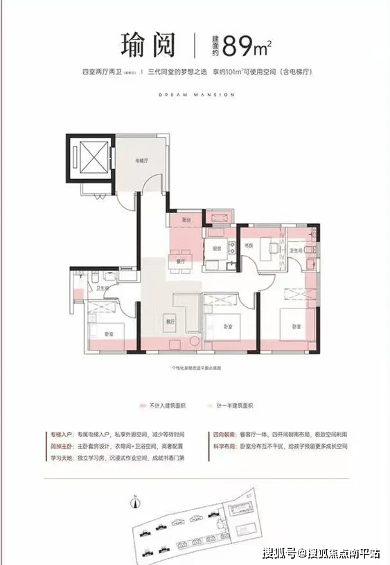 建面约89平户型: 纯板楼小高层+私梯入户,四开间朝南,可使用空间(含电梯厅)约101m²,得房率约113%,可做四房,相当于以前130平户型。