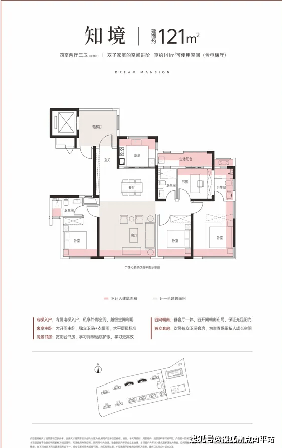 建面约121平户型: 纯板楼+私梯入户,四开间朝南,双套房朝南,可使用空间(含电梯厅)约141m²,得房率约116%,可做四房两厅三卫,相当于以前160平户型。