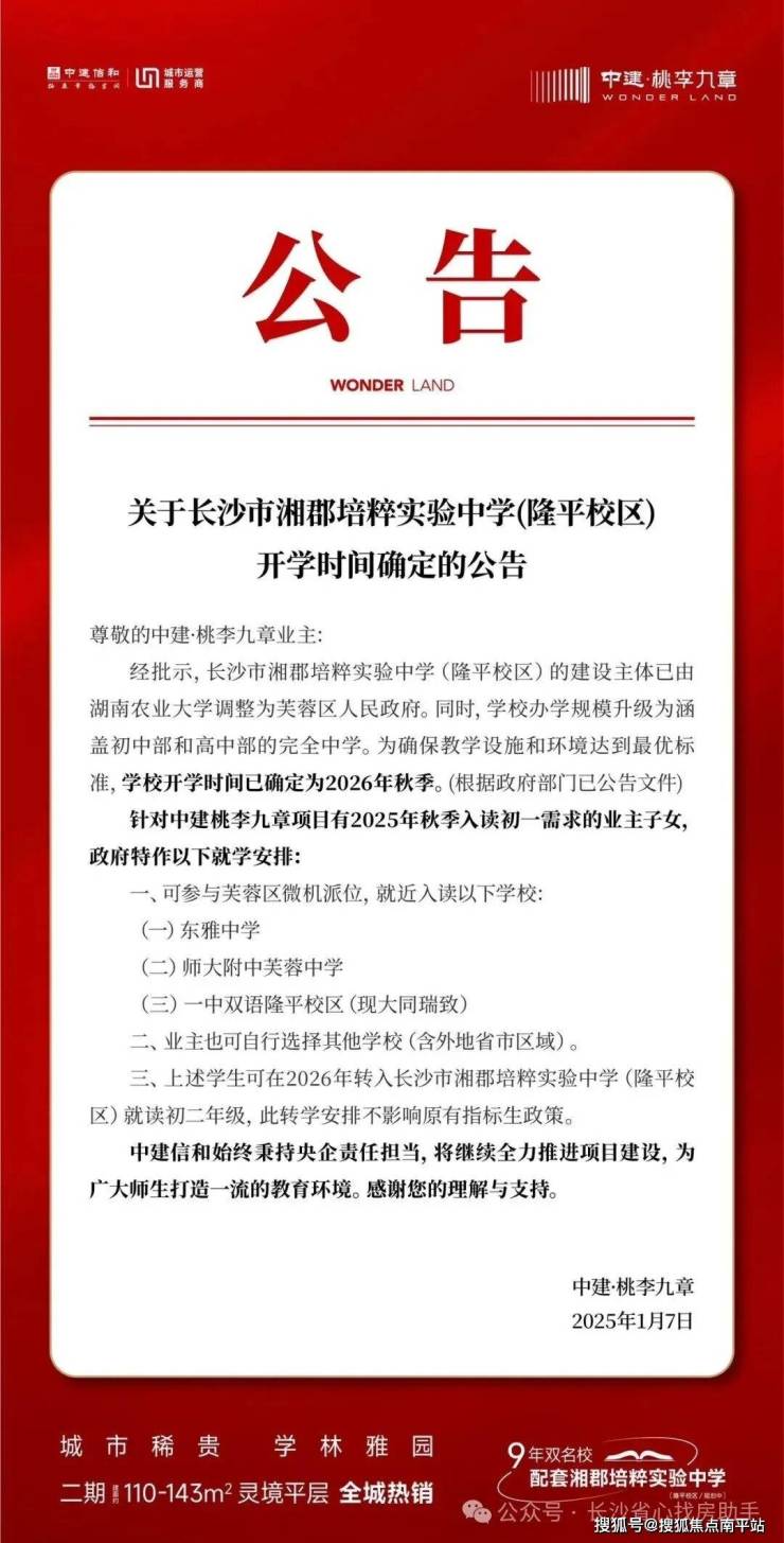 中建桃李九章项目配套入读湘郡培粹实验中学一校两址隆平小区(规划中),是芙蓉区唯一9年双名校配套入读项目