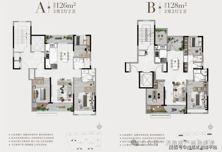 26-128平为项目的最小户型,均为三室两厅两卫,三叶草布局,户型格局相近
